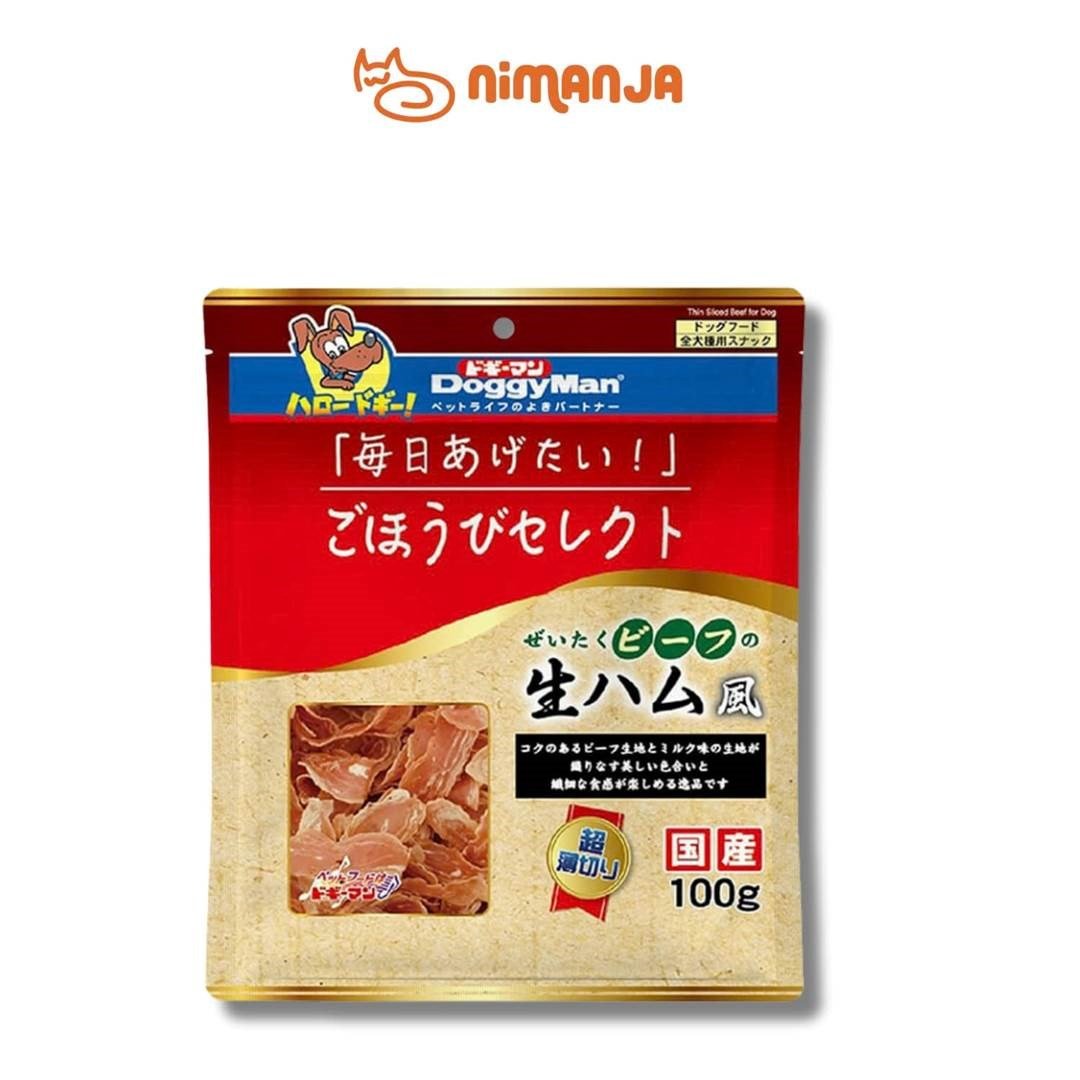 Giăm bông sấy vị bò 100g (thương hiệu DoggyMan) là món ăn nhẹ giàu dinh dưỡng cho thú cưng, được làm từ thịt tươi ngon (gà, bò) kết hợp hương vị sữa thơm béo. Sản phẩm có kết cấu mềm, dạng lát mỏng, giúp kích thích vị giác và cung cấp protein cần thiết, phù hợp cho chó.